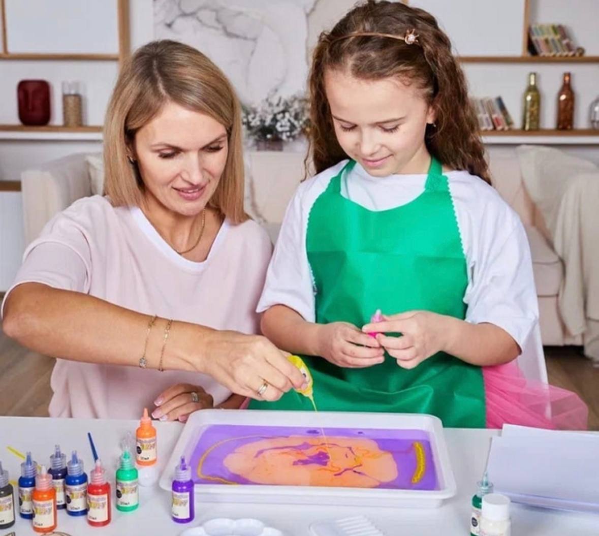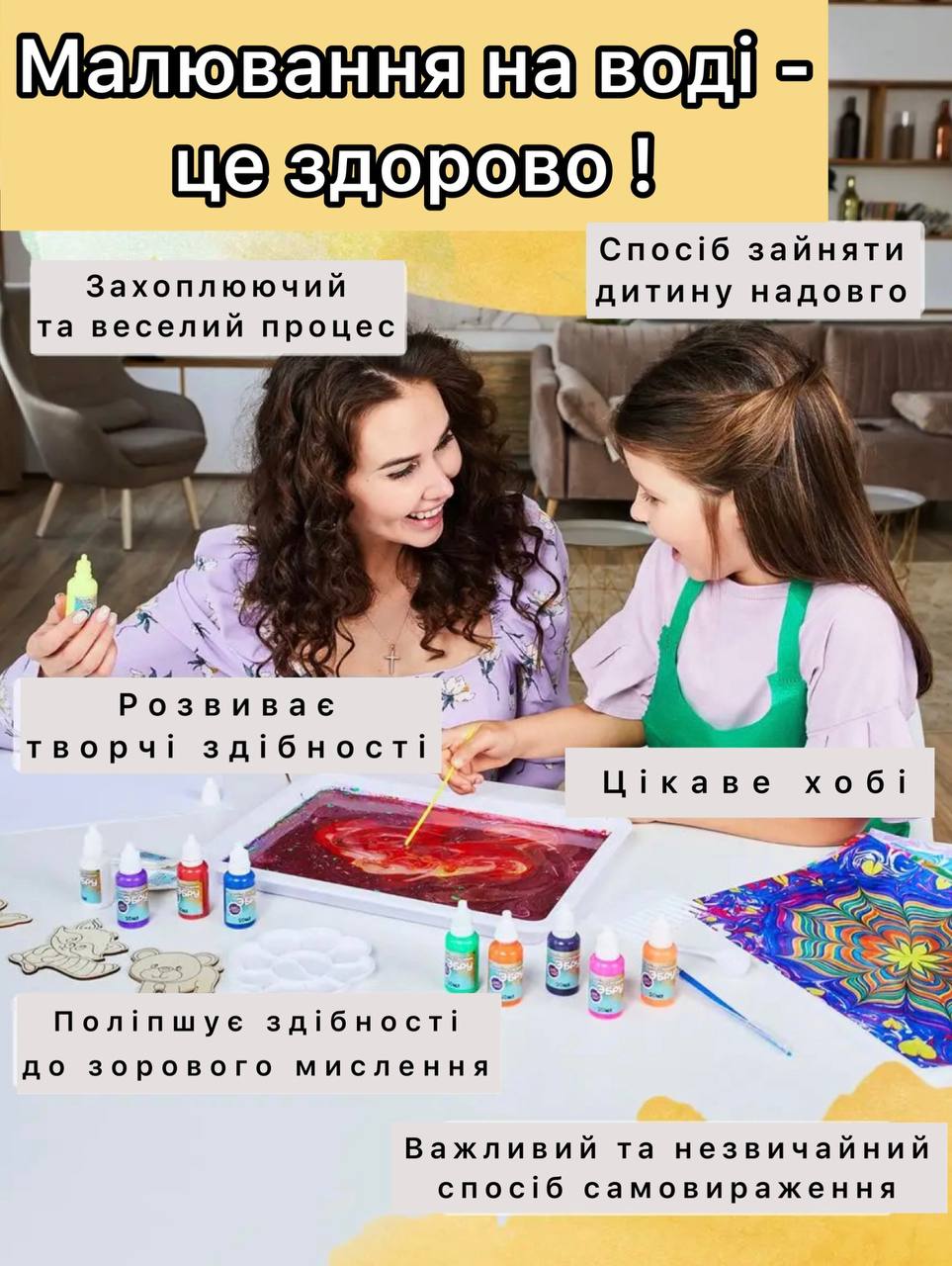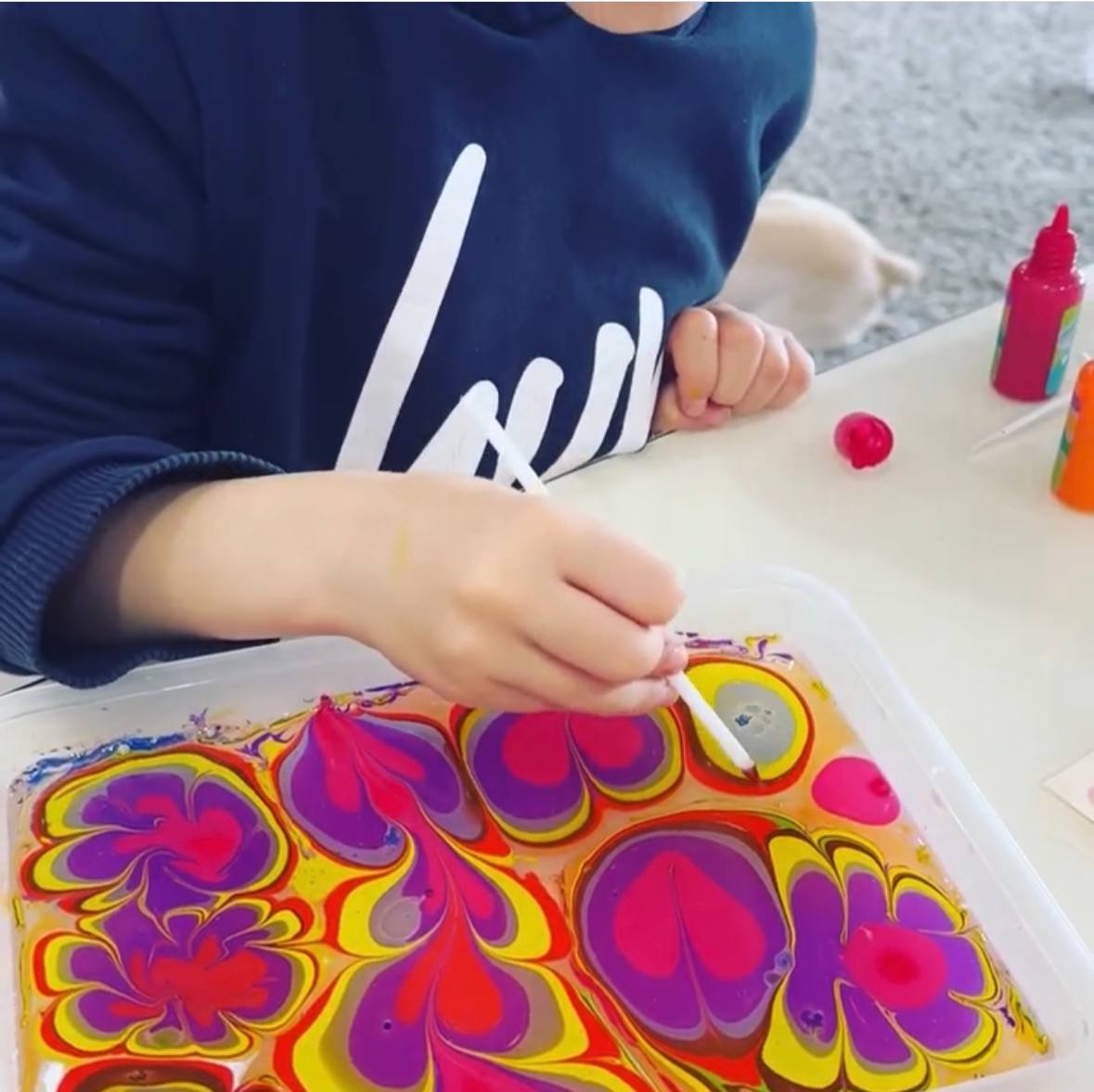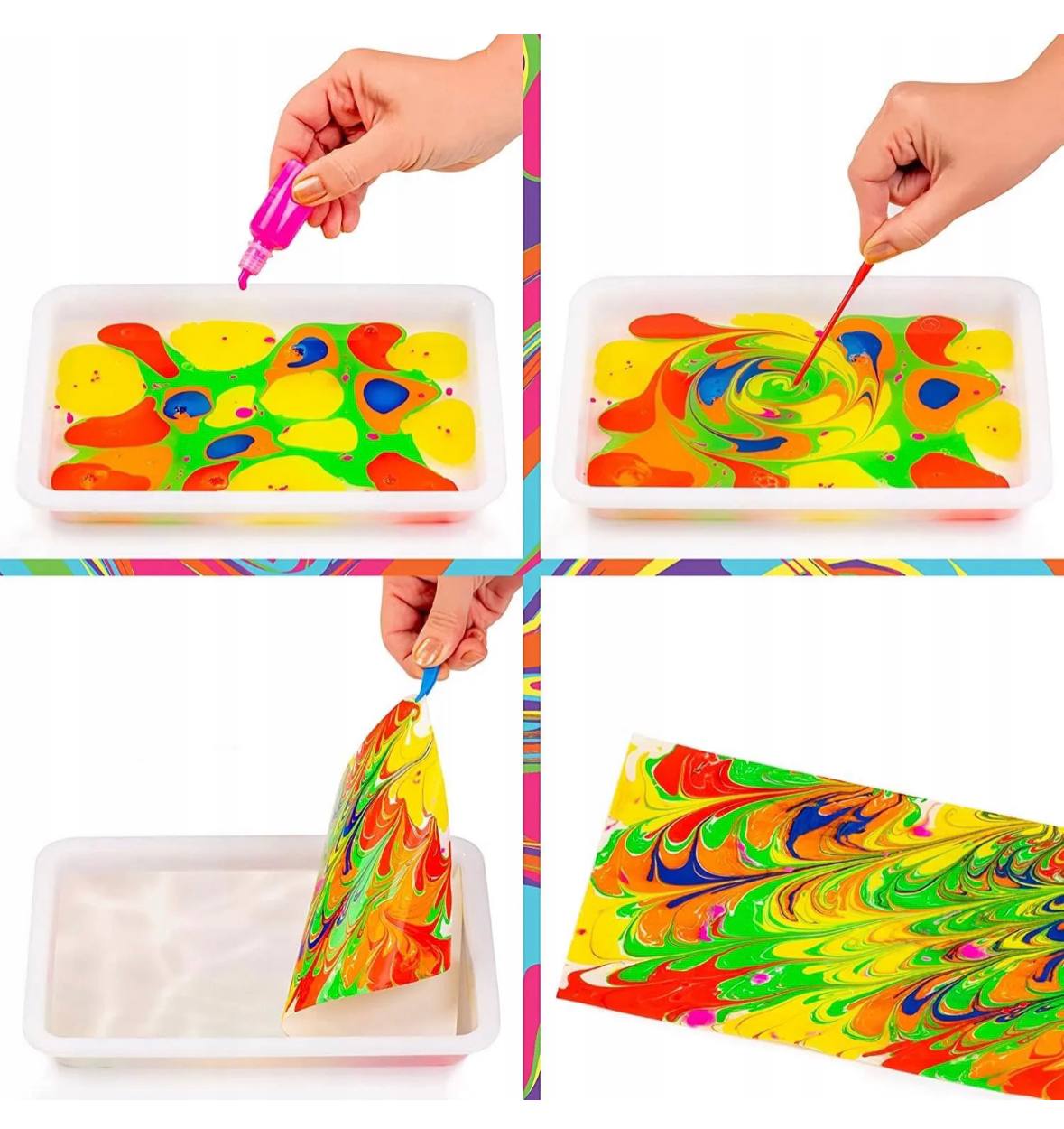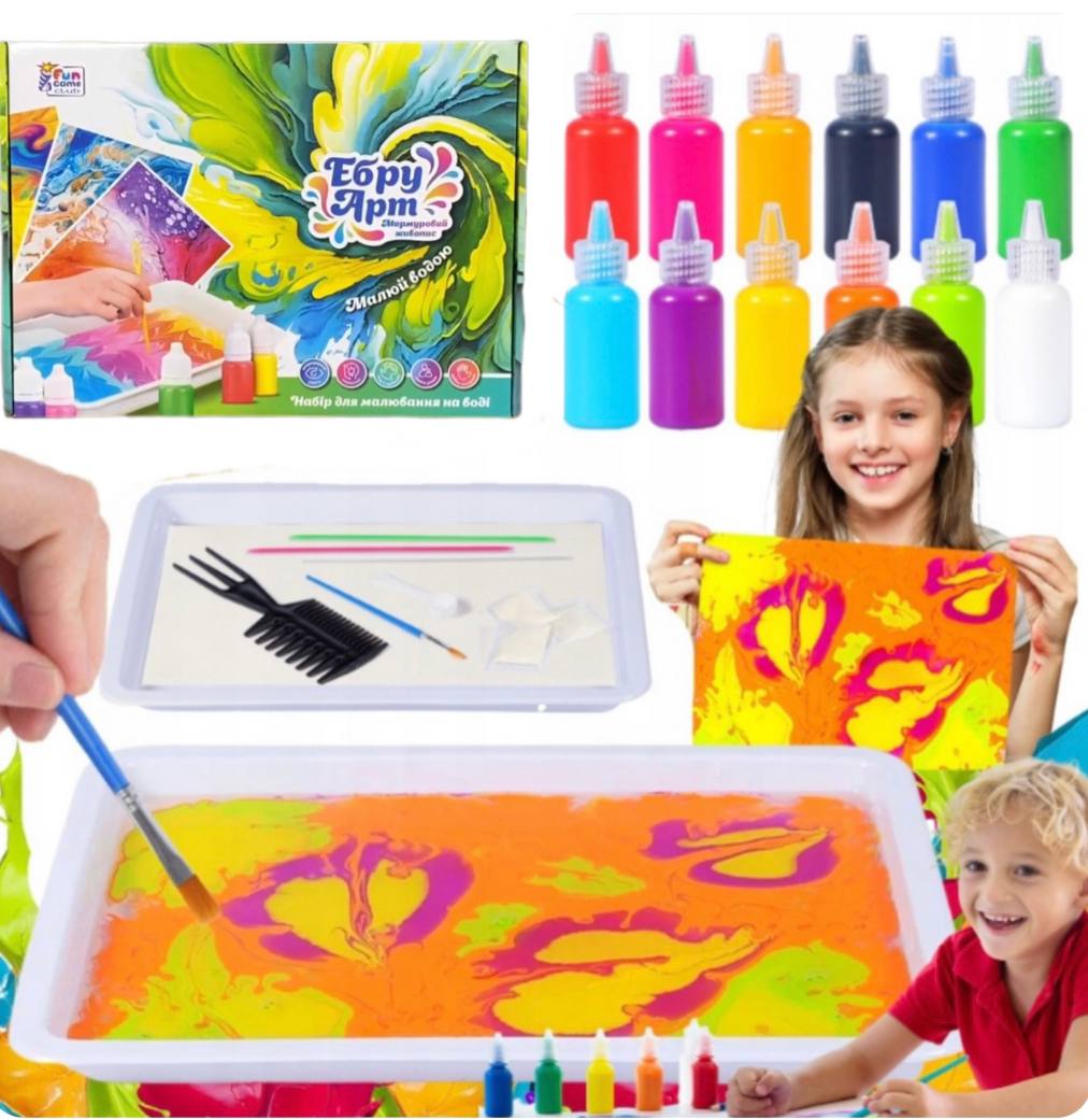 Мистецтво ЕБРУ - це соблива техніка малювання на поверхні води з подальшим перенесенням зображення на папір або іншу тверду основу! Ебру для дітей - це не лише мистецтво, але і захоплюючий процес, який розвиває творчість та уяву. Ця техніка дозволяє малюкам випробувати нові форми вираження та виробити власний стиль.